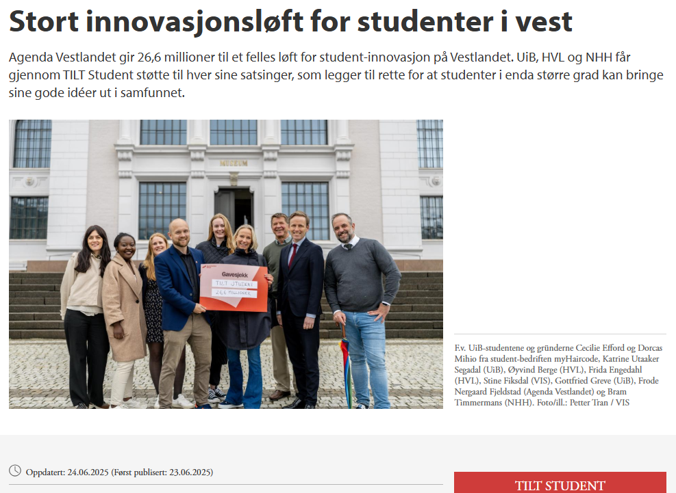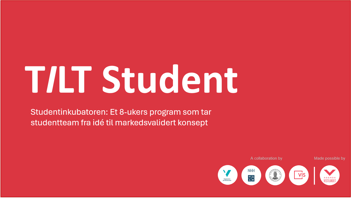 Malin Husefest fra VIS kommer og forteller om satsingen på studententreprenørskap og TILT Student med VIS, som hun skaper sammen med Renate Hvidsten Skoge, Lars Grønnestad, Kristine Aulie og mange andre dyktige kolleger både fra VIS - og ikke minst med Norwegian School of Economics (NHH) , Western Norway University of Applied Sciences og University of Bergen (UiB).
